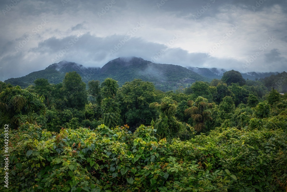 View from Indian train to unique and amazed nature scenic landscape of rain forest near Dudhsagar Falls. Goa, India. Tourism beautiful destination place. Discover India. Open world after covid-19