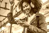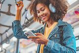 Closeup - Happy young African American woman passenger listening music via smart mobile phone in a train, Smile female wearing wireless headphones while moving in the tram, lifestyle, transportation