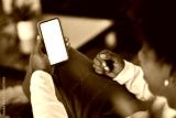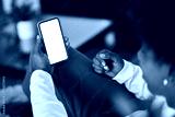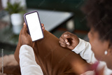 Over shoulder view of gen z African American teen holding smartphone mock up white cell screen template advertising mobile application, watching social media videos on cellphone at home on couch.