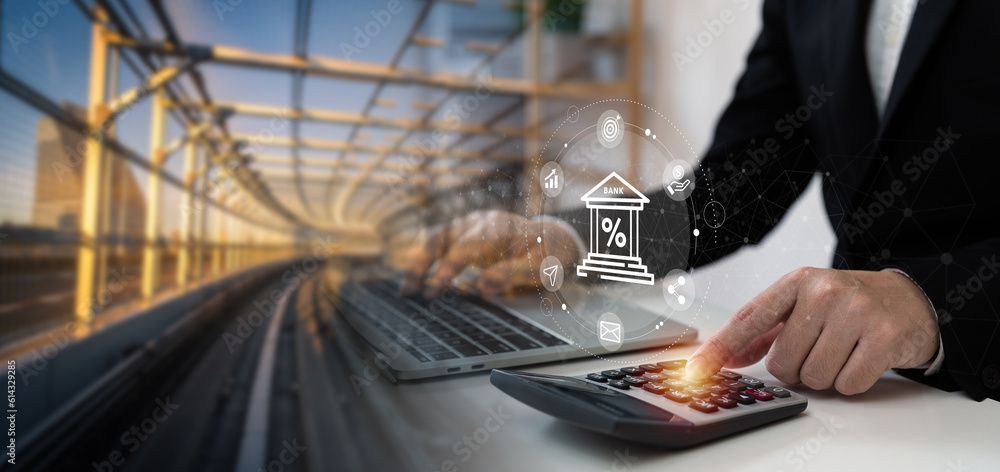 Banking percentage calculator concept, money planning management, target success, interest rate, income and return, investment fund, dividend tax, retirement, revenue growth, chart, graph, database.
