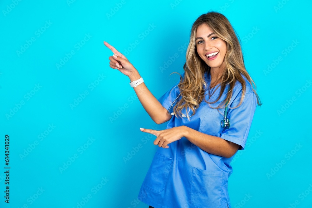 Young caucasian blonde doctor woman wearing blue uniform point at copyspace recommend sales discounts