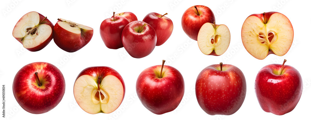 Red apple apples, many angles and view side top sliced halved cut isolated on transparent background cutout, PNG file
