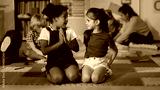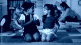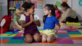 Multiracial little girls tell secrets sitting on floor in kindergarten