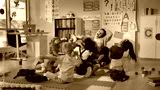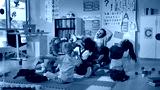 Group of elementary students exercising with teacher sitting on floor in classroom
