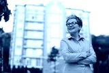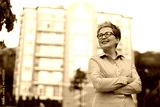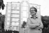 Cheerful smiling mature woman realtor with crossed arms on her chest against the backdrop of a new house.