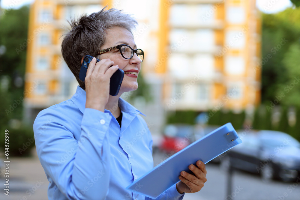 A woman realtor with a phone and a contract in her hands against the backdrop of an apartment building.