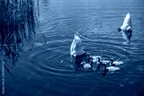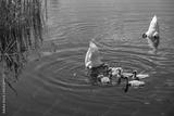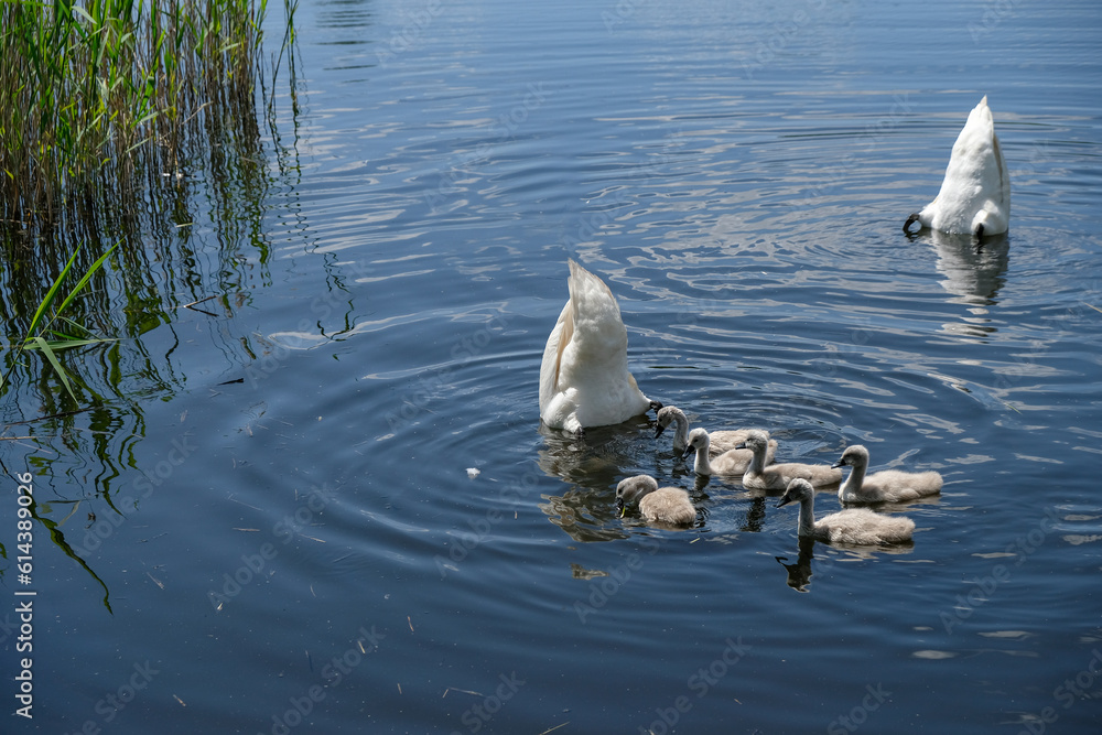 Swan family swims in the pond. Parents are looking for food. Large family. Copy space.