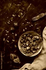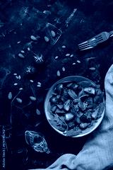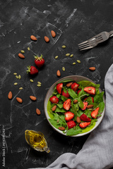 Summer vegan salad. Dietary salad with strawberries, arugula, spinach, nuts and pumpkin seeds in a bowl on a black stone background. Top view, flat lay, copy space, vertical.