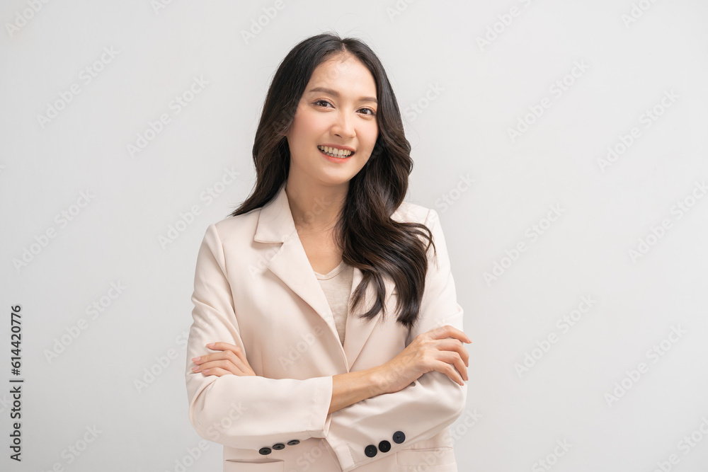 Smiling positive, attractive asian young woman, girl in beige suit formal dress, portrait elegant of pretty with long black hair, feeling happy looking at camera standing isolated on white background.