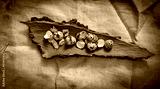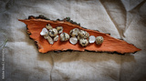 The shells of quail eggs on the oak bark. Hemp canvas fabric.
