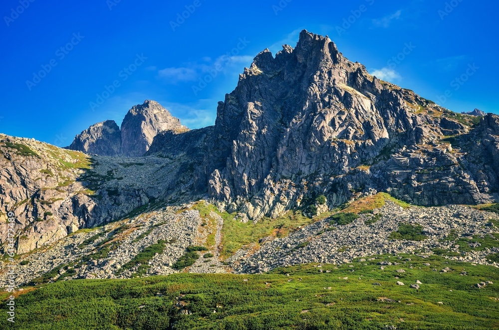 Summer mountain landscape in Slovak mountains. Beautiful rocky peaks in High Tatra, Slovakia.