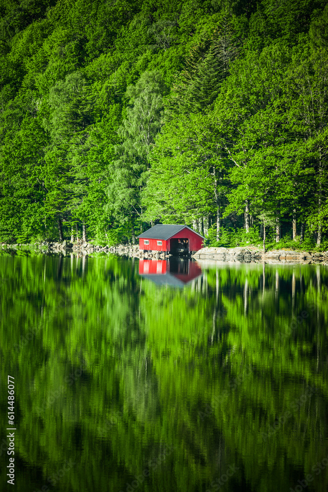 Rotes Bootshhaus am Ufer eines Sees in Norwegen