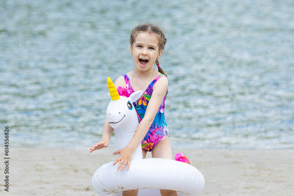 Adorable happy smiling little girl on beach vacation with swimming ring unicorn