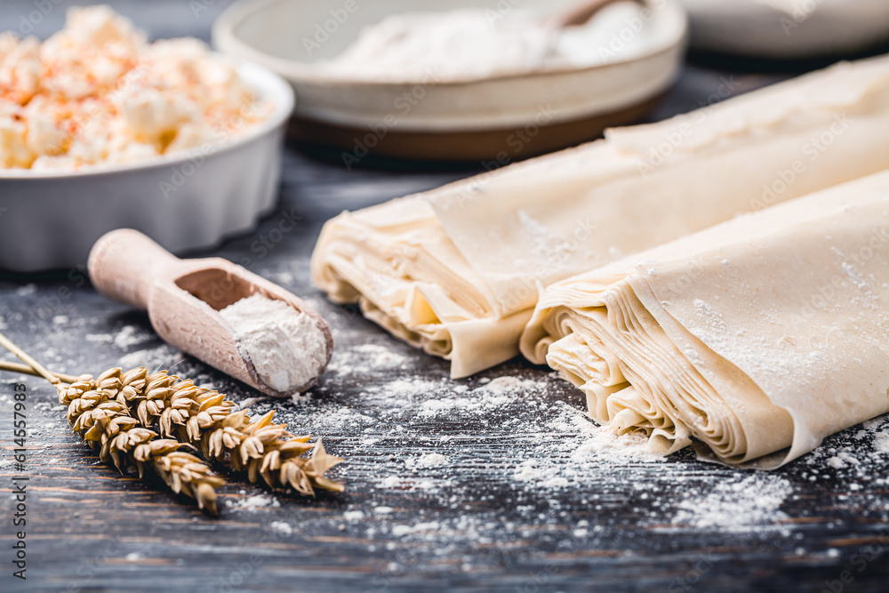 Baking preparation of savory pie with phyllo dough sheets stuffed with feta cheese