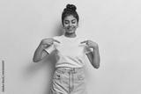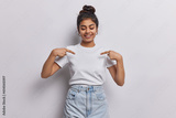 Young dark haired woman captures attention with her vibrant energy with contagious smile directs focus to her blank white tshirt using two fingers shows place for your logo or design poses indoor