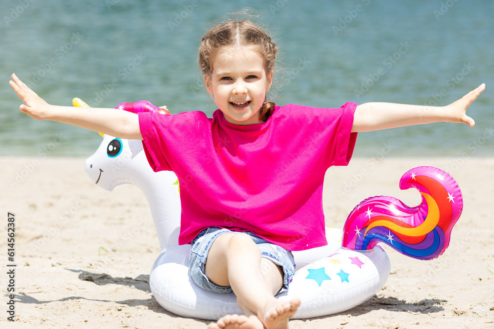 Adorable happy smiling little girl in pink t-shirt has fun with swimming ring unicorn on beach vacation. Happy summer vacation concept