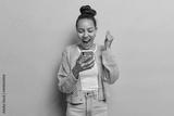 Studio shot of overjoyed brunette Latin woman celebrates victory raising clenched fist exclaims loudly reacts to something awesome wears knitted jumper and jeans isolated over pink background