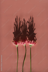 Three pink gerber flowers with aesthetic sunlight shadows on deep pink background. Minimal stylish still life floral composition