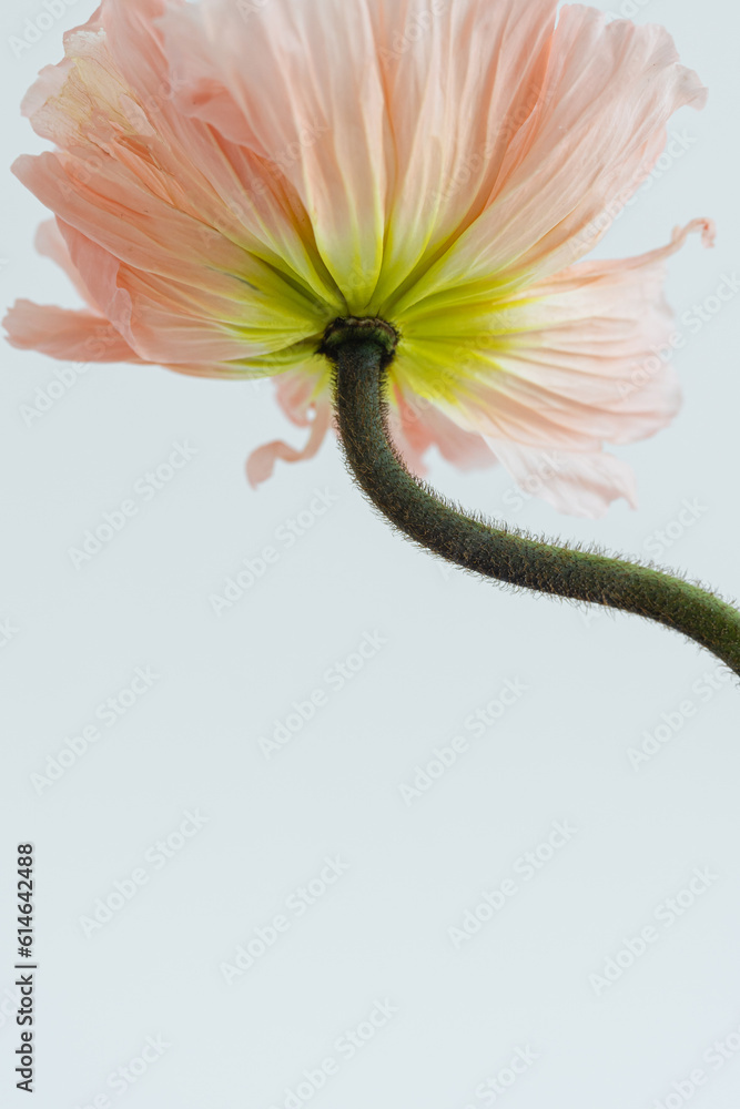 Peachy poppy flower on white background. Minimal stylish still life floral composition