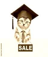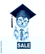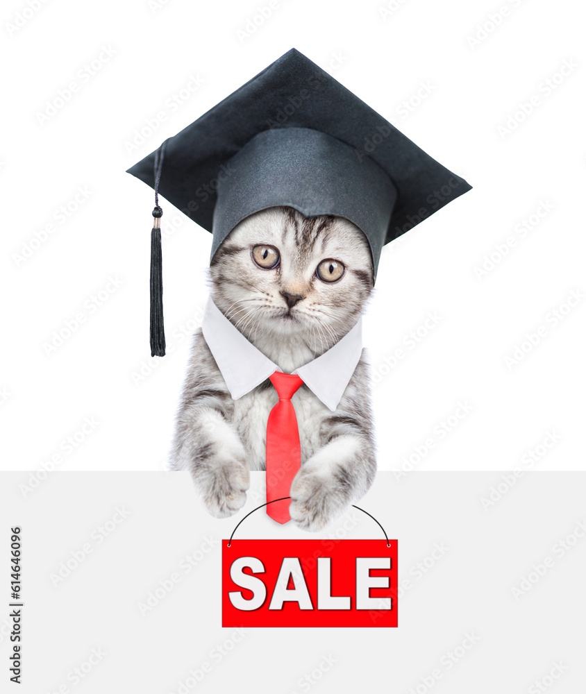 Happy graduated cat wearing necktie looks above empty white banner and holds signboard with labeled "sale". isolated on white background