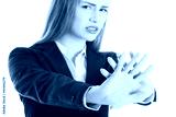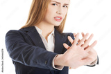 Beautiful caucasian business woman showing stop gesture.