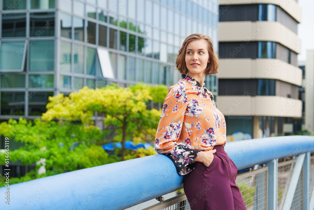 casual businesswoman in the city. Positive elegant girl with short hair posing on the street.