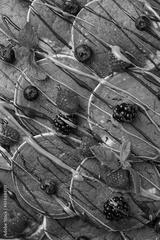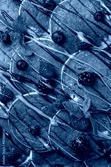 Food background. Pancakes with chocolate and pistachio topping and fresh berries, blueberry, raspberry, boysenberry. Directly above, top view.