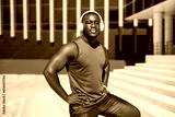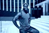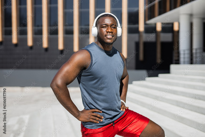 portrait of a handsome african man in sportswear wearing headphones