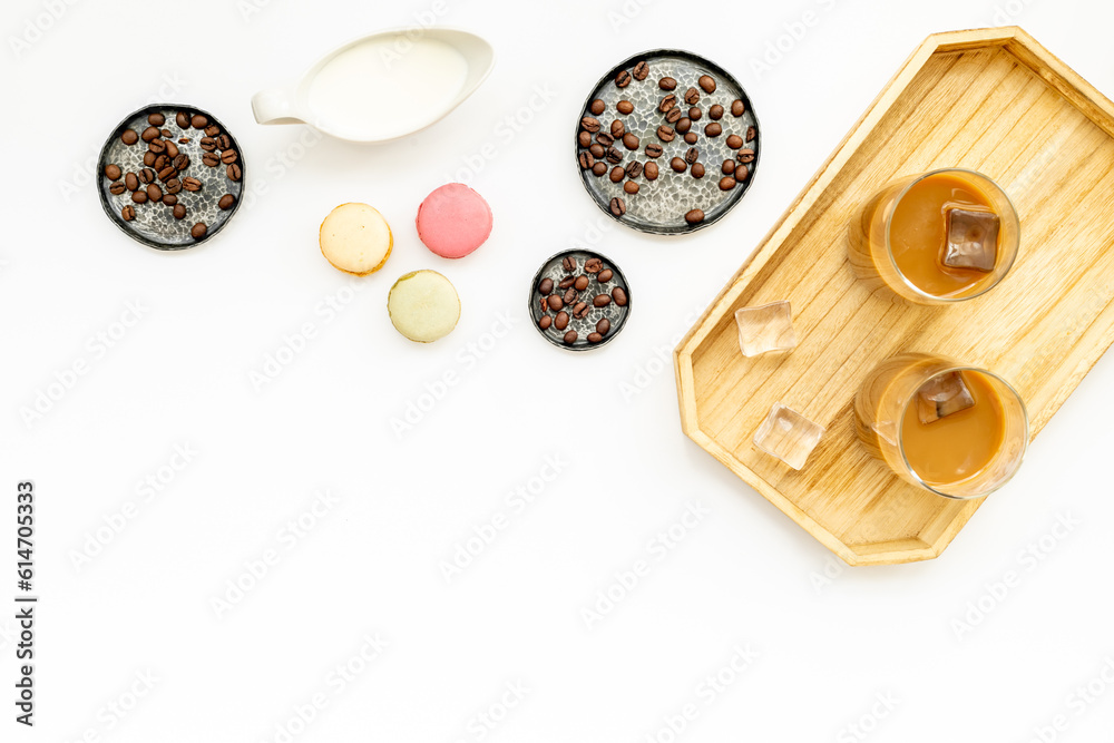 Top view of cold latte coffee with ice and coffee beans