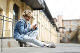 A modern young guy in a denim jacket sits outside and writes a message on the phone.