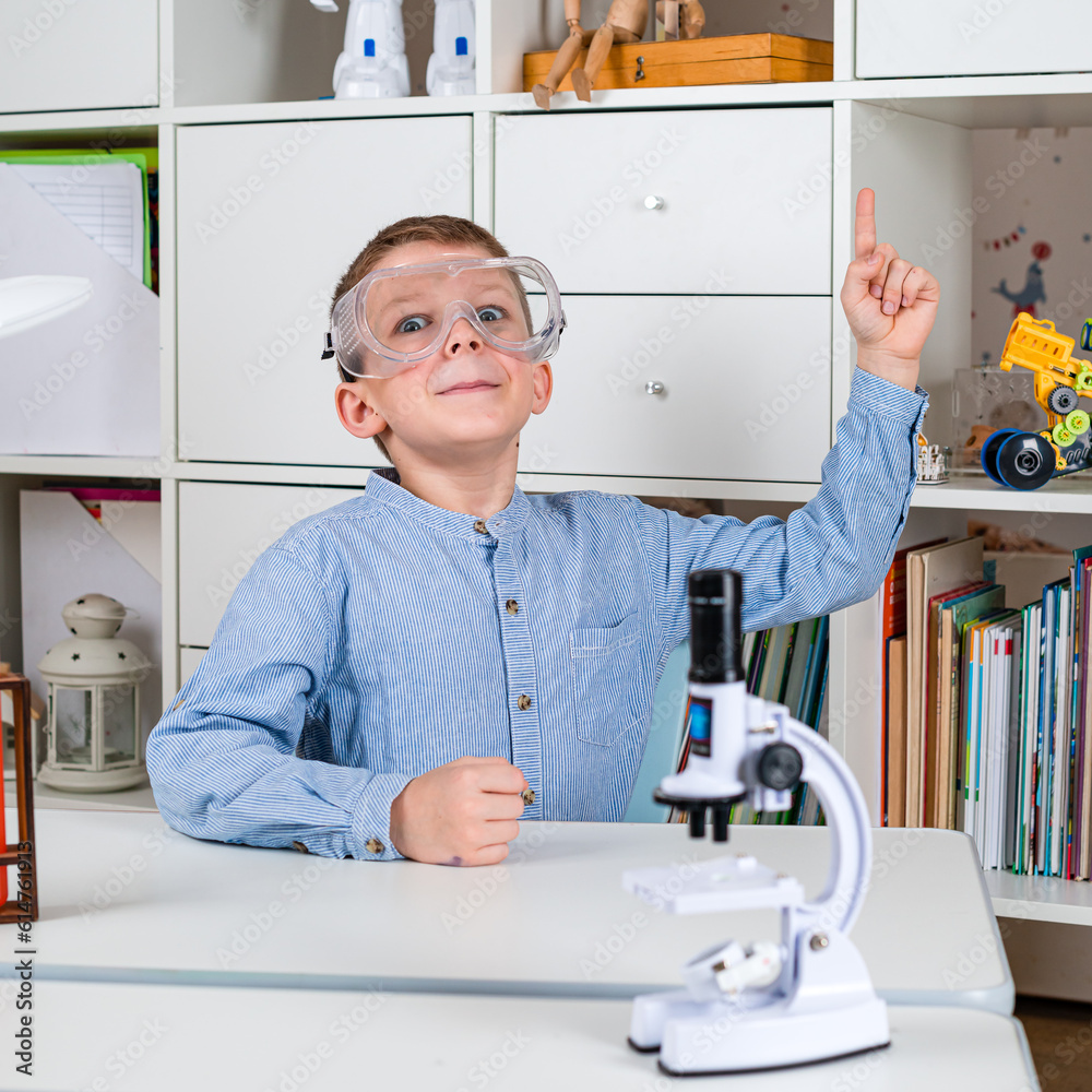 Surprised young scientist boy with a microscope.