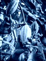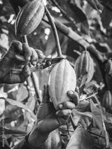 Close-up hands of a cocoa farmer use pruning shears to cut the cocoa pods or fruit ripe yellow cacao from the cacao tree. Harvest the agricultural cocoa business produces.