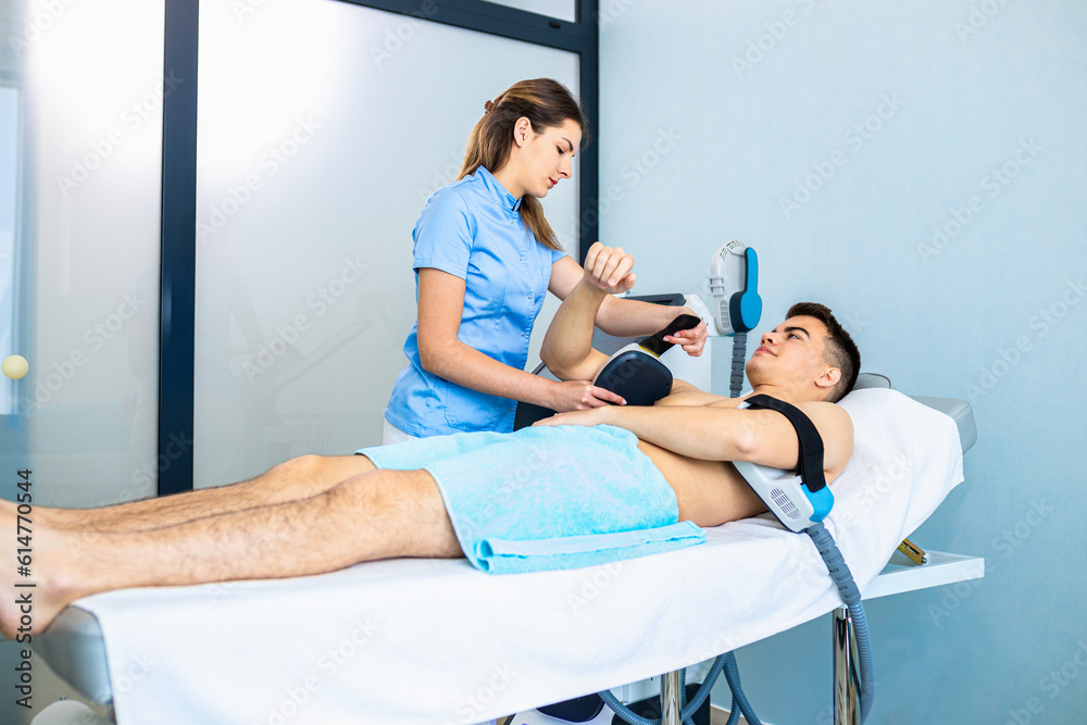 Beautician therapist applying burn fat and build muscles treatment in beauty salon to young man.