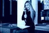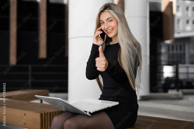 beautiful young woman with laptop with hand gesture