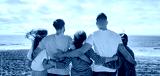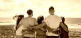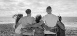 Millennial diverse people in casual hugging, enjoy vacation, freedom on sea beach at weekend outdoor