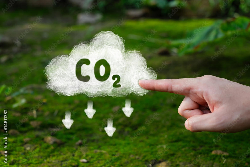 Hand pointing at Co2 cloud, Concept of Reduce Carbon dioxide emission and pollution. Sustainable development, renewable energy. Clean atmosphere, Carbon footprint. Greenhouse gas control.