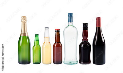 Liquor, Martini, Vodka, beer, wine, champagne. Alcoholic beverages, bottles. Collection of bottles isolated on transparent background. Studio photography.