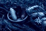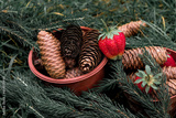 Spruce branch. Cones in flower pots. Strawberries. New Year or Christmas. Changed color.