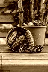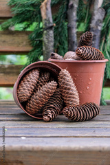 Cones in flower pots. Spruce branch. Wood. Raindrops. Rainy Christmas. Copy space.