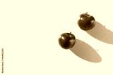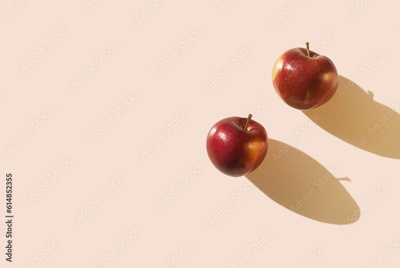 Two red apples on light background with long shadows. Eco-friendly products and healthy food concept. Apple Day. Copy space. Space for text