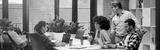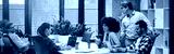 Office life. Group of young multiracial people sitting at the table in coworking space and working together, using modern technologies and discussing project