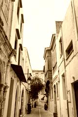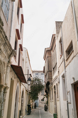 Street view with old medieval historic buildings and flowers in small town in Greece, Crete. Traditional European, Greek architecture. Summer travel