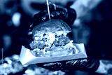 Street food burger on hand on hipster food market background. Grill and barbecue food