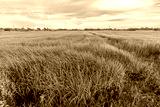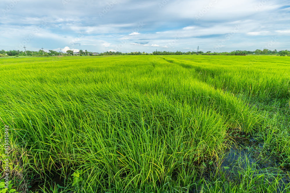 Scenic view landscape of Rice field green grass with field cornfield or in Asia country agriculture harvest with fluffy clouds blue sky daylight background.