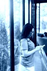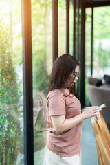 Happy of asian freelance people business female read writing message on smartphone in at the cafe, Business Lifestyle communication concept