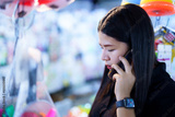 Portrait asian woman tourist in black shirt dress with a smartphone on Night market stalls Thailand.