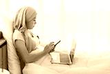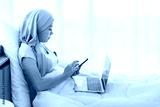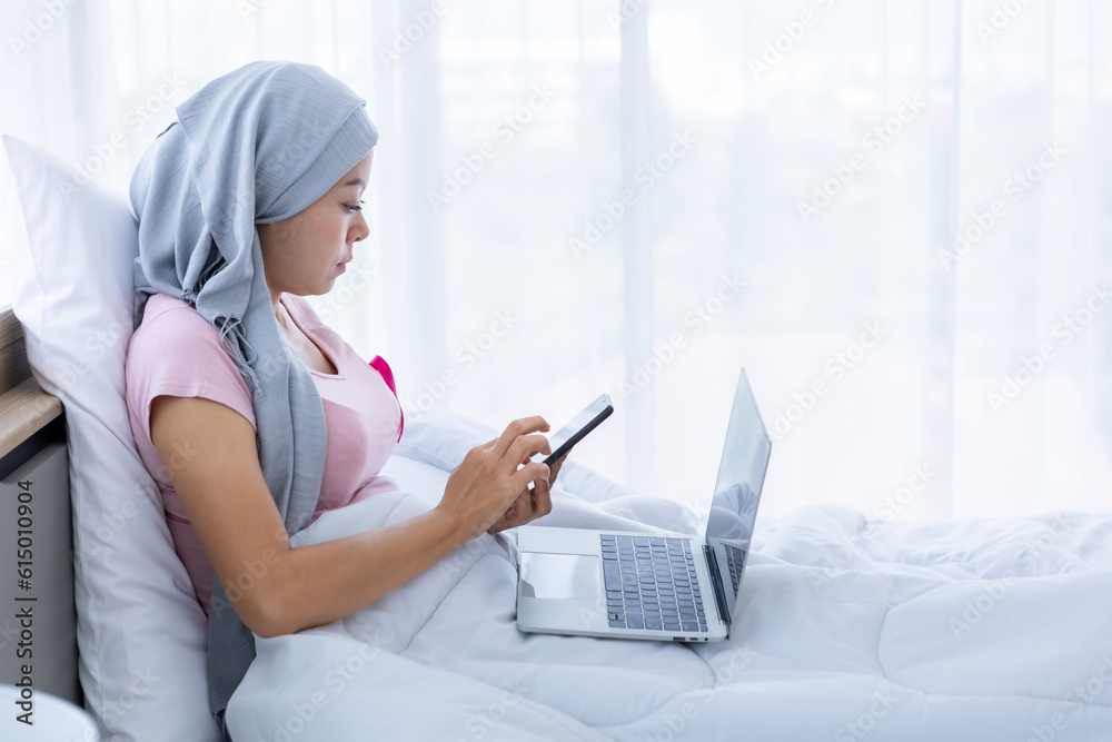 a asian women disease mammary cancer patient hold pick up smartphone casual working with laptop computer with pink ribbon wearing headscarf on bed In the bedroom at the house,healthcare,medicine
