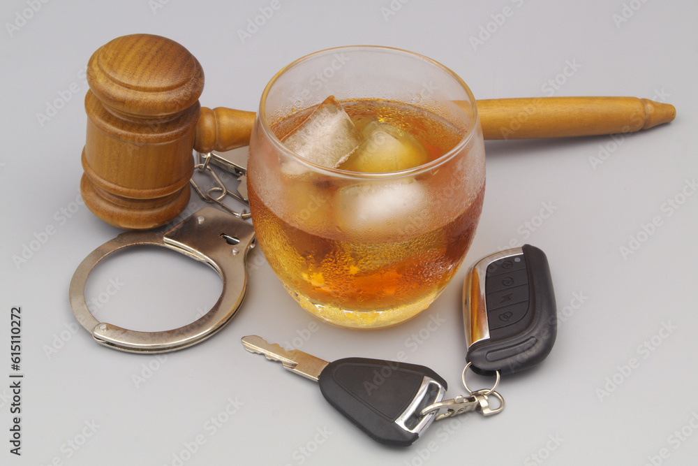 Wooden Judge gavel, steel handcuffs, car key with glass of whisky.