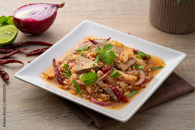 Spicy minced pork salad ,Laab moo ,Mixed Pork with boiled skin and liver in spicy lime sauce