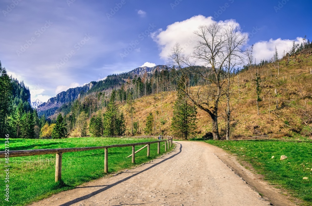Spring mountain landscape in Polish mountains. Gravel road in Koscieliska Valley in Tatra Mountains, Poland.